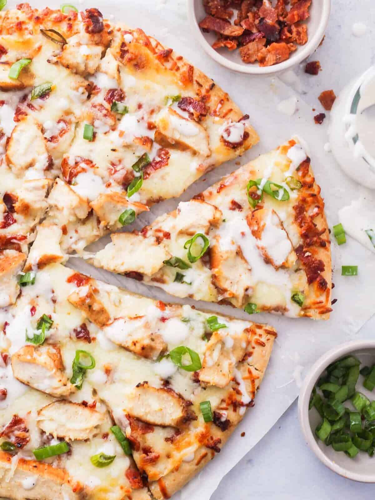 Creamy ranch sauce topped with tender grilled chicken, melted mozzarella, and a sprinkle of herbs for a perfect savory bite.